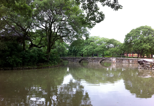 雨だった一日、ふらふらとひとり、街を散歩してきました。 ホテルのお兄さんに「お昼なんかおいしいとこない?」っていったら、タクシーの運ちゃんと相談して連れてってくれました。 ナムウォンはあんまり都会じゃないけど、歴史のある街で、春香伝説というのがあります。 いわば韓国版ロミオとジュリエット。300年前のお話。 その舞台となったのが、ここ広寒桜園(グァンファンルーウォン)です。 この周りにはナムウォンの名産「ドジョウチゲ」屋さんが沢山あります。 で、運ちゃんはここに連れてきてくれたので、ありがたく ただのチゲを注文しました。 ドジョウチゲは前の日に食べたばっかだったので。 しかし5000ウォン(450円)でこの料理。 美味い安い早い揃ってます。 食べた後少しだけ時間があったので、せっかくなのでその庭園も見てきました。 このスーパーブランコで春香(チュンニャン。庶民)が遊んでるところを、えらいとこの李ぼっちゃんが見初めたそうな。 でも今は春香ではない人が乗ってました。 ちゅんにゃーん! は実家にいました。お母さんの月梅(ウォルメ)とごはん食べてました。 李さんと逢瀬を重ねた橋とか。 雨上がりでいい雰囲気の庭園でした。 |
