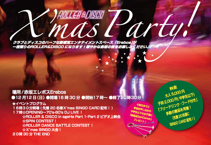□■□ 2010 ROLLER&DISCO X’masParty □■□ 【日時】 12月12日17時〜 【場所】 赤坂エレボス ローラーディスコ、今年の締めくくりです。 赤坂でやるようです。 おどれー♪ 詳細はコチラ |