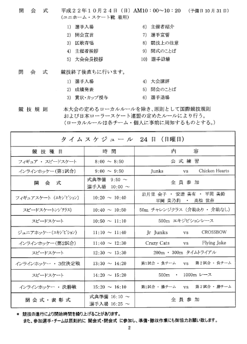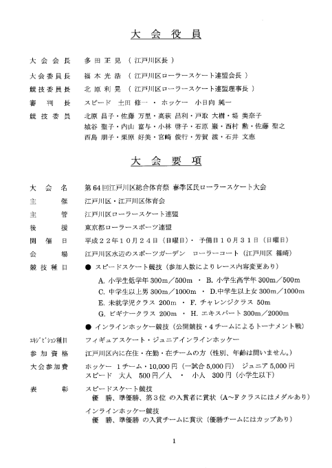 □■□ 小岩特別支援学校 スケート教室 □■□ 【場所】 江戸川区・都立小岩特別支援学校 【日時】 2010年11月3日(水) 14時〜16時 【主催】 支援学校保護者有志 【後援】 江戸川区ローラースポーツ連盟 前回に引き続き、今度は講師として行ってきました。 ちなみに前回は宇田川東京都連盟会長も見に来てくれてました。(10月13日のレポート) 江戸川区連盟の北原さんが動いて、メインのコーチにはアースビートの石原さんが毎週来てくれています。 教室には障害のある子だけでなく、健常の子も参加しています。 参加してみたい方は江戸川区連盟に問い合わせて下さい。 生徒が特別支援学校の子なので、「ハイこれやってー」「次これやって〜」という風には進みません。 「じゃ、こんな風にやってみようかー」「お、それもいいかもー」という感じで、のんびりやるのが良さそうです。 通常の教室のような「達成度」よりも、「満足度」を重視するといいかな。 もちろんいつも両方考えているけれど、比重をどちらに置くかの問題。 想像でしかないけれど、親御さんにとって障害のある我が子というのは、もちろん大切な存在ではあるけれど、それだけに毎日の生活で障害のない子の親よりも苦労することが多いと思います。 だからこそ、こういう教室は貴重な受け皿であると思ってくれている、と思います。 一方で、体育館を会場として使わせてもらえる、行政に近い側から理解してもらえる、というのはスケートを普及させる側としても貴重な場です。 区連盟だけでなく都連としても力を入れていくべきだと強く思います。 本日のカリキュラム ・あいさつ ・ラジオ体操 ・靴を履く ・歩く練習 ・滑る練習 ・自由滑走(親・指導員がマンツーマンで) ・サーキット(輪くぐり →玉拾い →玉入れ →マットの上歩き) ・終わりのあいさつ PR |