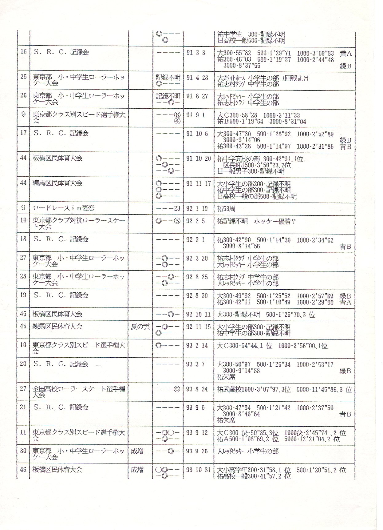 痛くて直立できません。 午前中ちょいとお出かけした後、 午後はハード筋トレ、のあと土砂降りの中、スーパーハードランニング。 でっかい陸上競技場がすぐ近くにあって、走りまくってきました。 中学生は普通に屋根なしトラックでスーパーハードなトレーニングしてました。 終わった後には死体がごろごろ転がってた。 出てきた記録 91〜93年 クリックで表示します。 SRCとあるのは「志村ローラークラブ」のこと 記録会で「緑B」とか書いてあるのは、1000mで、規定タイム毎にヘルメットに貼るテープが色分けされてたもの。 (水泳の赤線みたいなもの) 大→僕、祐→3兄、日→父 レッドビッキーとかはクラブのホッケーチーム名 記録会は半年に1度、春と秋に志村クラブ本拠の成増リンクで開催されます。 で、個人個人の成長度を計る。 やっぱり体の動く秋の方が記録がよくなります。 懐かしの嬬恋とか高校選手権とかがありますね。 高校選手権は、ジュニアの前身かな。 伊藤くん(志村クラブ→アースビート→専大)、三上くん(志村クラブ→XXX)三島さん(武相高校→専大→XXX)とかが出てました。 ちなみにこの頃はまだ完全にみんなクワッドローラースケートです。 |