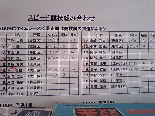 第63回都民体育大会 【期間】 平成22年5月9日〜5月30日 【会場】 江戸川区水辺のスポーツガーデン 都内54地区、15000人が参加するこの大会(もちろん全競技での話)、今年も文京区代表で参加してきました。 スピード、ホッケー、フィギュアの3種目得点合計で争われます。 本当は決勝日は23日だったのだけれども、そして23日だったら参加できなかったのだけれども、幸い(?)にして雨天順延だったため、30日にずれ込んでセーフ。 その代わり、順延のためかスピード種目は参加者がちょっと寂しい感じでした。 文京区は僕以外はホッケー選手です。 でも彼ら、3種目出場してます。すごい。 【300mタイムレース】 もちろん優勝。すごいタイムで。 ワッシーのスタートは相変わらず速そうに見える。 【500m予選・決勝】 得点を稼ぐには、2組に分かれた文京区2人とも決勝に残らねば!ということで1組目を抑えようとがんばったけれど、無理でした。相方山崎君がコケてしまった。。。がびーん。 決勝は勝ちました。 【2000リレー】 ほぼ異種格闘技線の様相。 2人1組で2周交代する、という決まりになっています。 しかし、各区ごとに道具の違いがすごい。 イ)インライン=インライン組 ロ)ホッケーシューズ=ホッケーシューズ組 ハ)インライン=ホッケーシューズ組 そして文京区はハ)の組合せでした。 並みいるインラインを押しのけて、見事優勝! (江戸川区と接触しちゃったんだけどね) さて、タイトルに書いた通り文京区は総合で優勝したのですが、、、 稼ぎ頭は頑張ったスピードではなく、ホッケーでもなく、 フィギュアでした。 よく見ると、、、 光ゲ○ジ来場!? 飾ってみたら意外にでかかった。 |